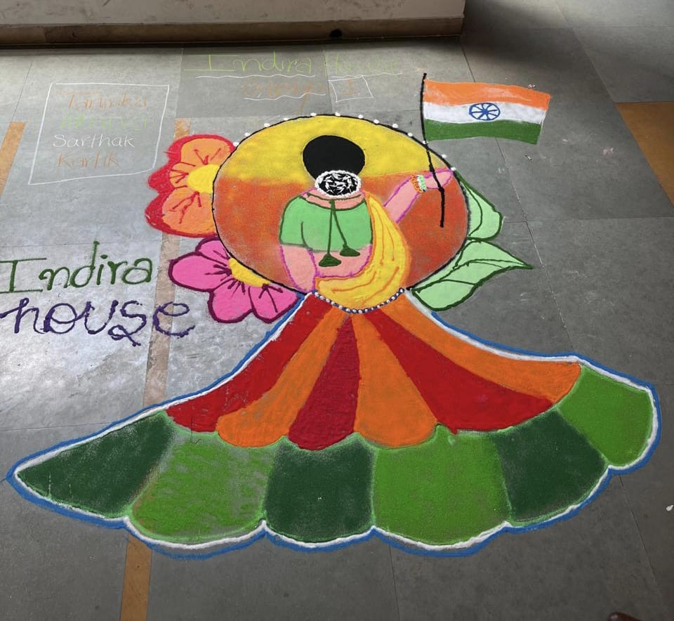 The school corridors came alive with vibrant colours as students designed stunning rangolis based on patriotic themes. Each artwork reflected creativity, teamwork, and national pride.