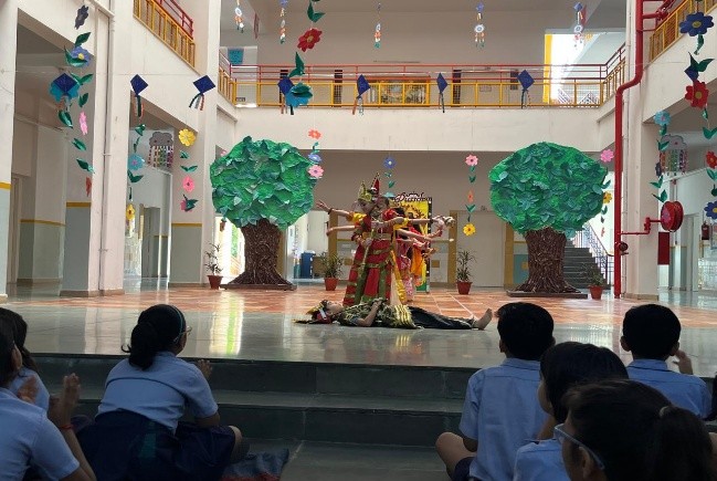 The young learners came dressed in colourful traditional attire, bringing festive cheer to the school campus. The celebration began with a short cultural program including songs, dances, and a skit depicting the story of Lord Rama’s victory over Ravana followed by Nine goddesses’ Avtaars. The children beautifully showcased the values of courage, truth, and righteousness.