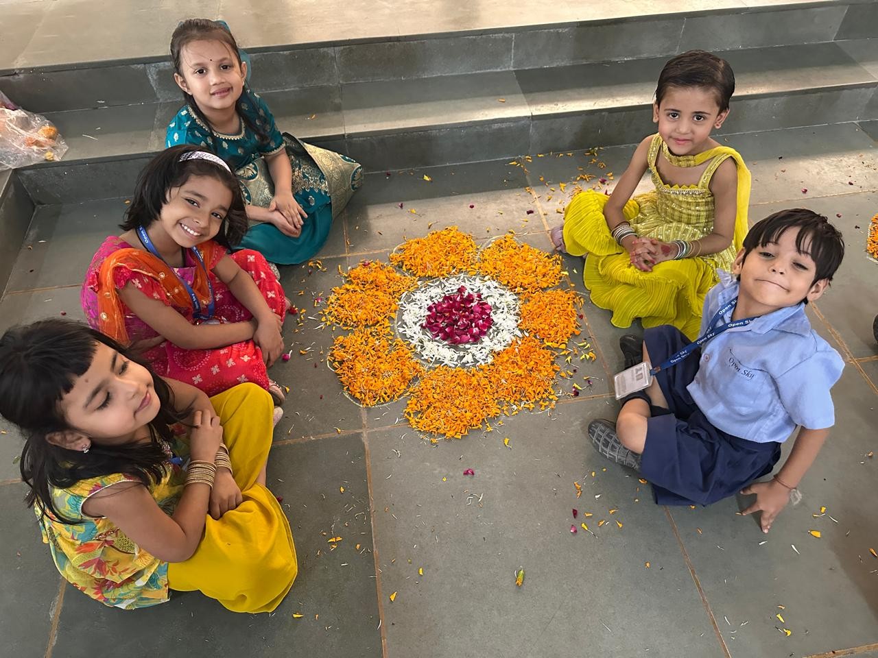The celebration was followed by a Rangoli Competition, where our budding artists created vibrant patterns using petals, and sparkles. Their creativity and teamwork were truly impressive!