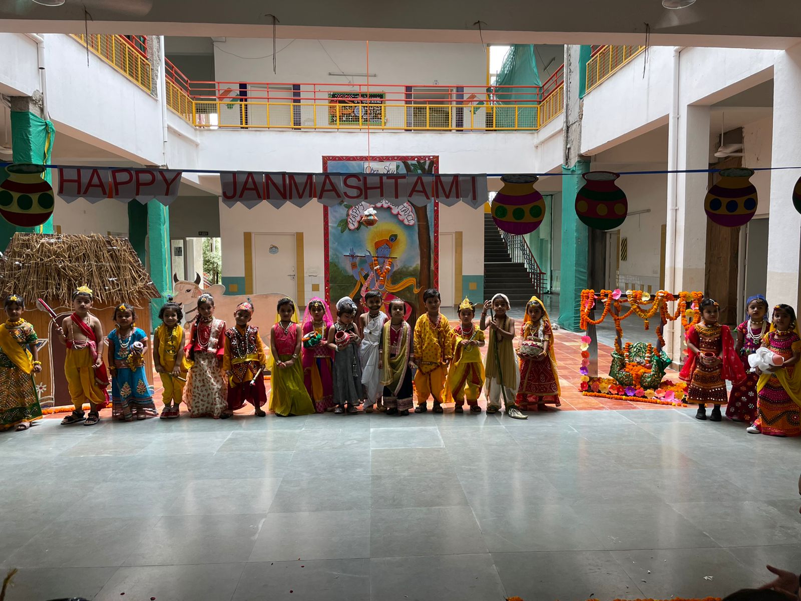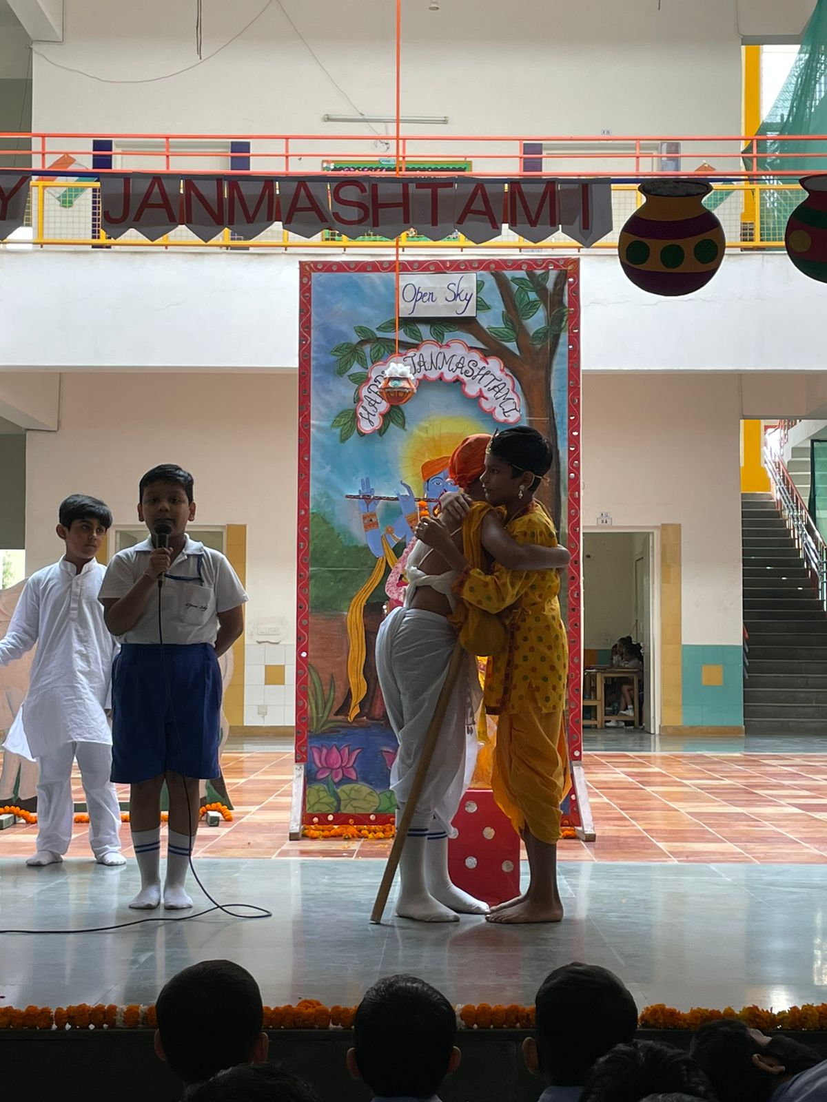 At Open Sky, Krishna Janmashtmi was celebrated by the staff and students of Pre-Primary and Primary wing on Thursday, August 18, 2022. Janmashtmi is celebrated as a symbol of the end of darkness and rooting out of the evil forces. The school premises was decorated beautifully and the spirit of festivity was enhanced with tableau depicting the life history of Lord Krishna.  A splendid and colourful performance by the students, depicted the birth of lord Krishna. Students truly communicated the message that “Every moment of life is worth a celebration. The more you praise and celebrate life, the more there is in life to celebrate.” Children came dressed in ethnic wear for a ramp walk as Radha, Krishna, Sudama, Kansa, Devaki. It was a beautiful presentation with joyous melody and twirling dancers.