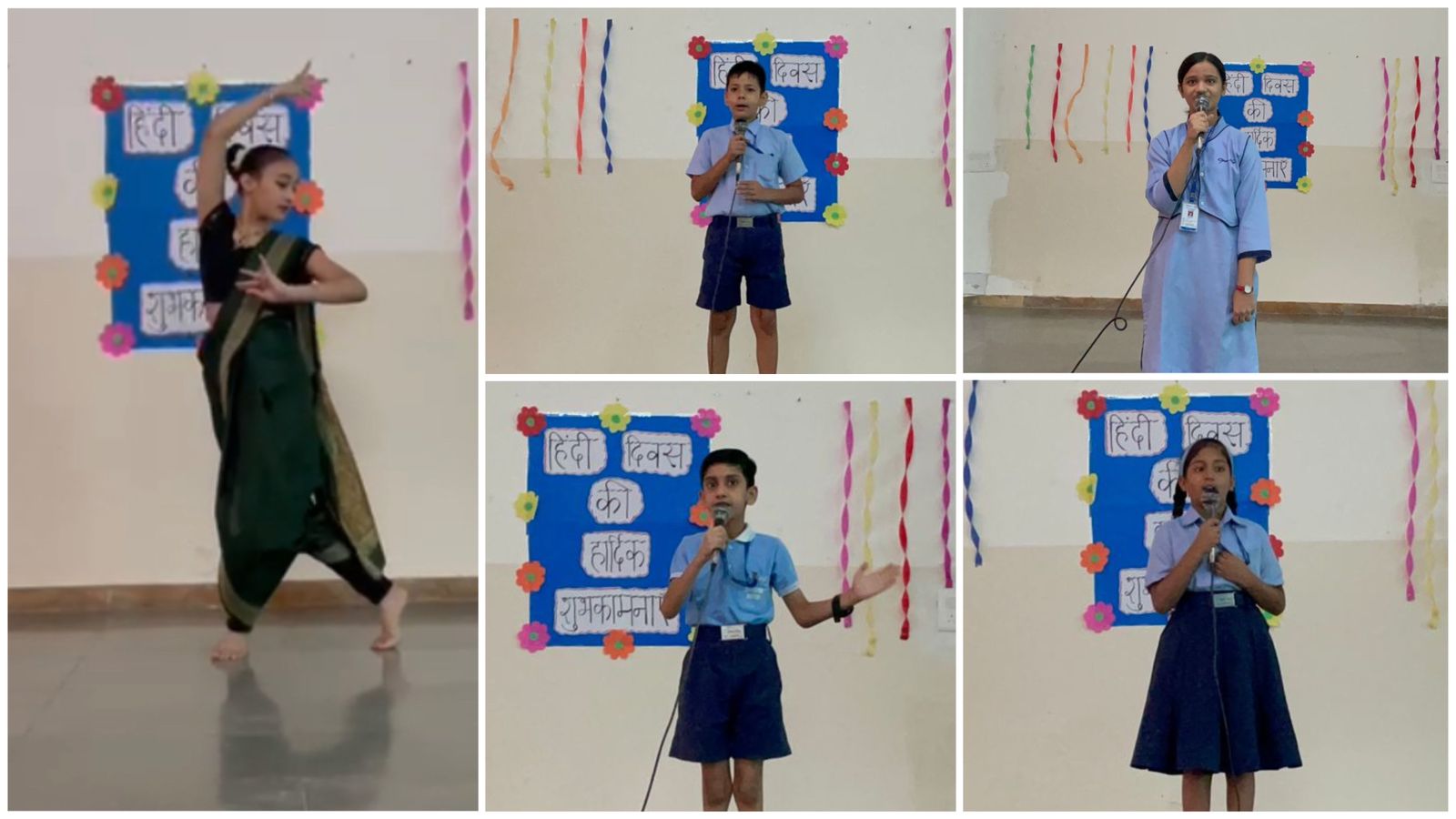 The programme was organised by the Hindi department and presented by a very talented group of young performers and presenters from Classes V to IX. The celebration commenced a dance performance, nukkad natak, doha recitation, poem saluting the richness of our national language. They enthralled their teachers and friends. It was a pleasure to watch students perform so confidently. Students could also be seen engaged in slogan writing and poster making. The school head, Mrs. Bharti Arora underscored its significance in connecting us to our roots.